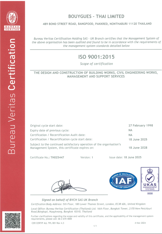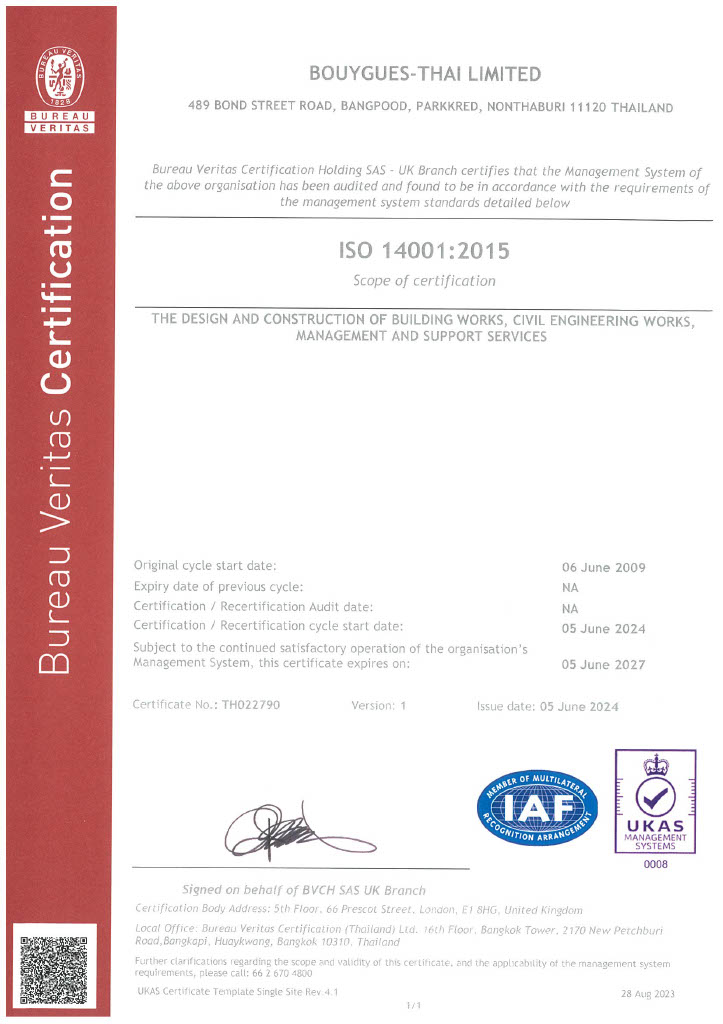 Bouygues-Thai has achieved the highest level of certifications across various sectors : environmental, management, safety and quality assurance.